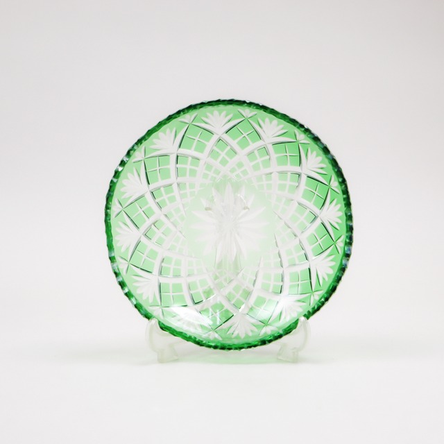 商品説明: 爽やかな翡翠色が目を惹く、切子の皿です。 透明感のあるグリーンのガラスに、菊花を思わせる繊細なカットが丁寧に施され、 光の角度によってきらめきが変わる美しい逸品です。 縁のギザギザとしたスカラップカットが柔らかな表情を添え、 食卓だけでなく、インテリアとしても上品な存在感を放ちます。 和の伝統美とモダンなデザインが融合した、日常を彩るガラス皿です。 利用シーン: ・涼を感じる食卓に 夏の冷菜やデザートを盛ると、ガラスの透明感と緑の輝きが涼やかな印象を演出します。 ・おもてなしの器として 果物や和菓子、前菜などを盛り付けると、食卓が一層華やかに。来客時にもおすすめです。 詳 細 ・サイズ: 高さ:約4.5cm、横:約16cm 簡易測定になりますので若干の誤差はご了承ください。 ・重さ: 約423g ・状態: 目立ったキズは見当たりませんでした。 若干の汚れがございます。 ・その他: 不明な点などがありましたらご連絡ください。 ・Mngmt No. Ba31j