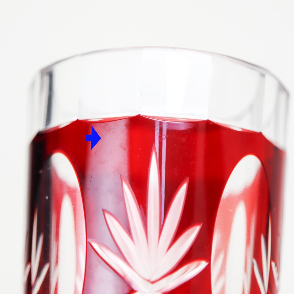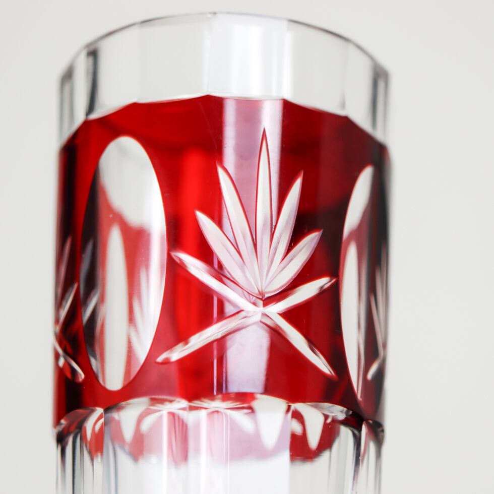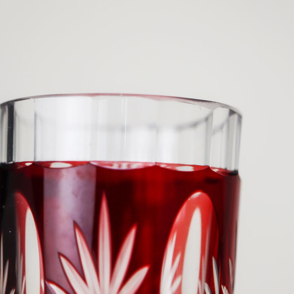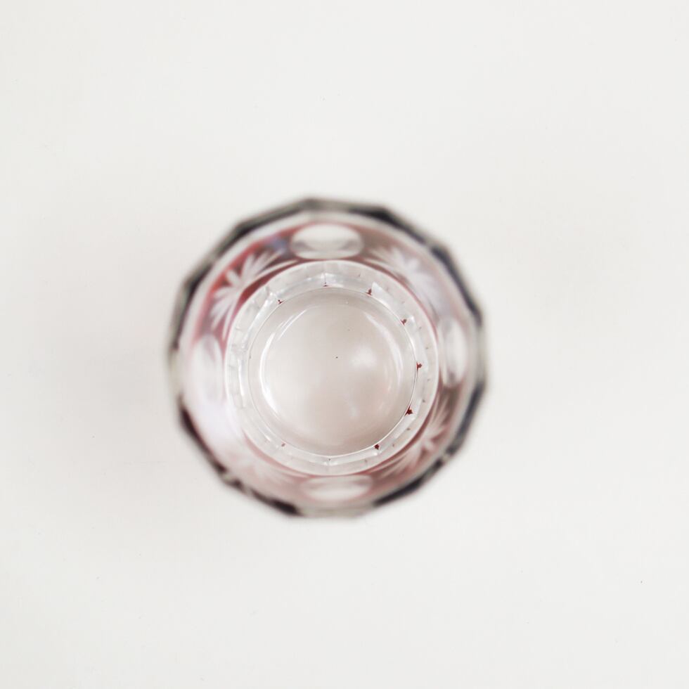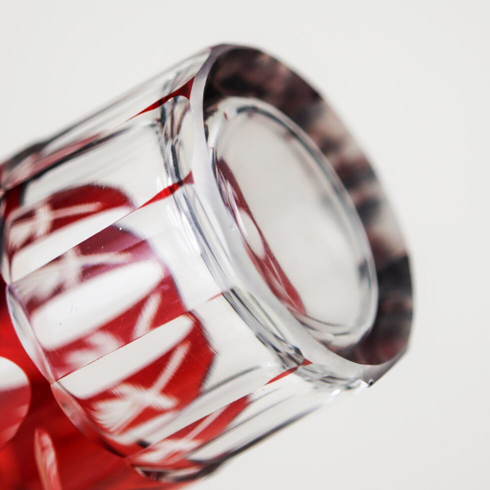 深みのある赤色ガラスに繊細なカットが施され、光を受けると華やかに輝きます。