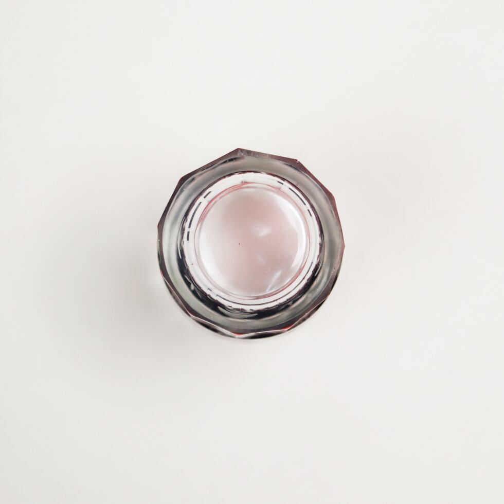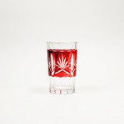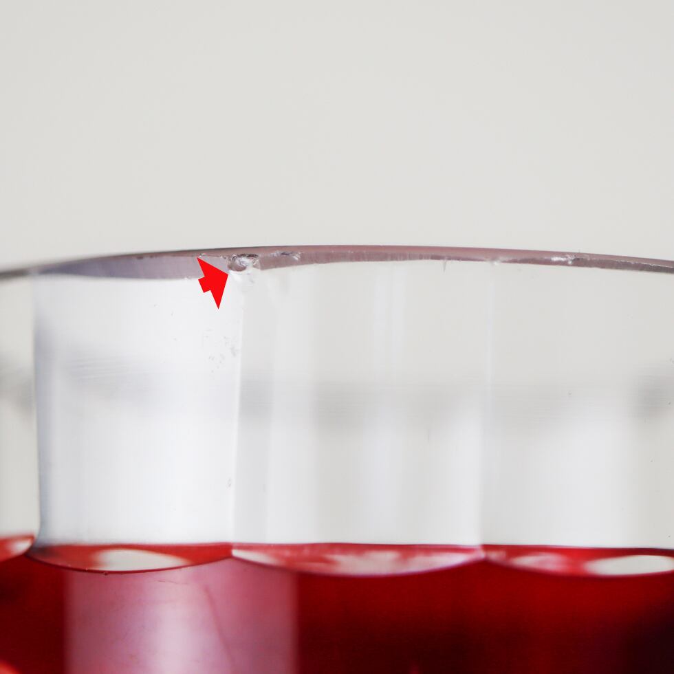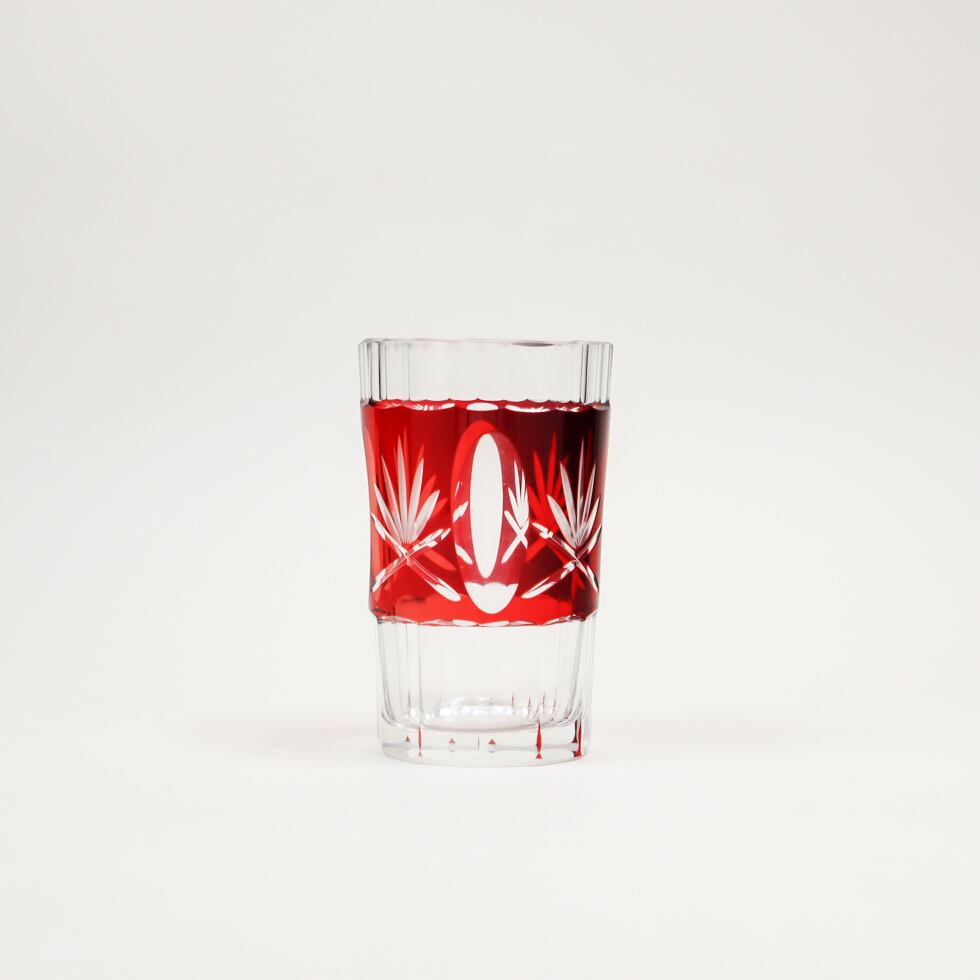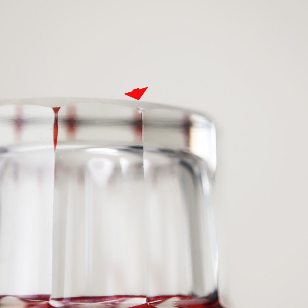深みのある赤色ガラスに繊細なカットが施され、光を受けると華やかに輝きます。