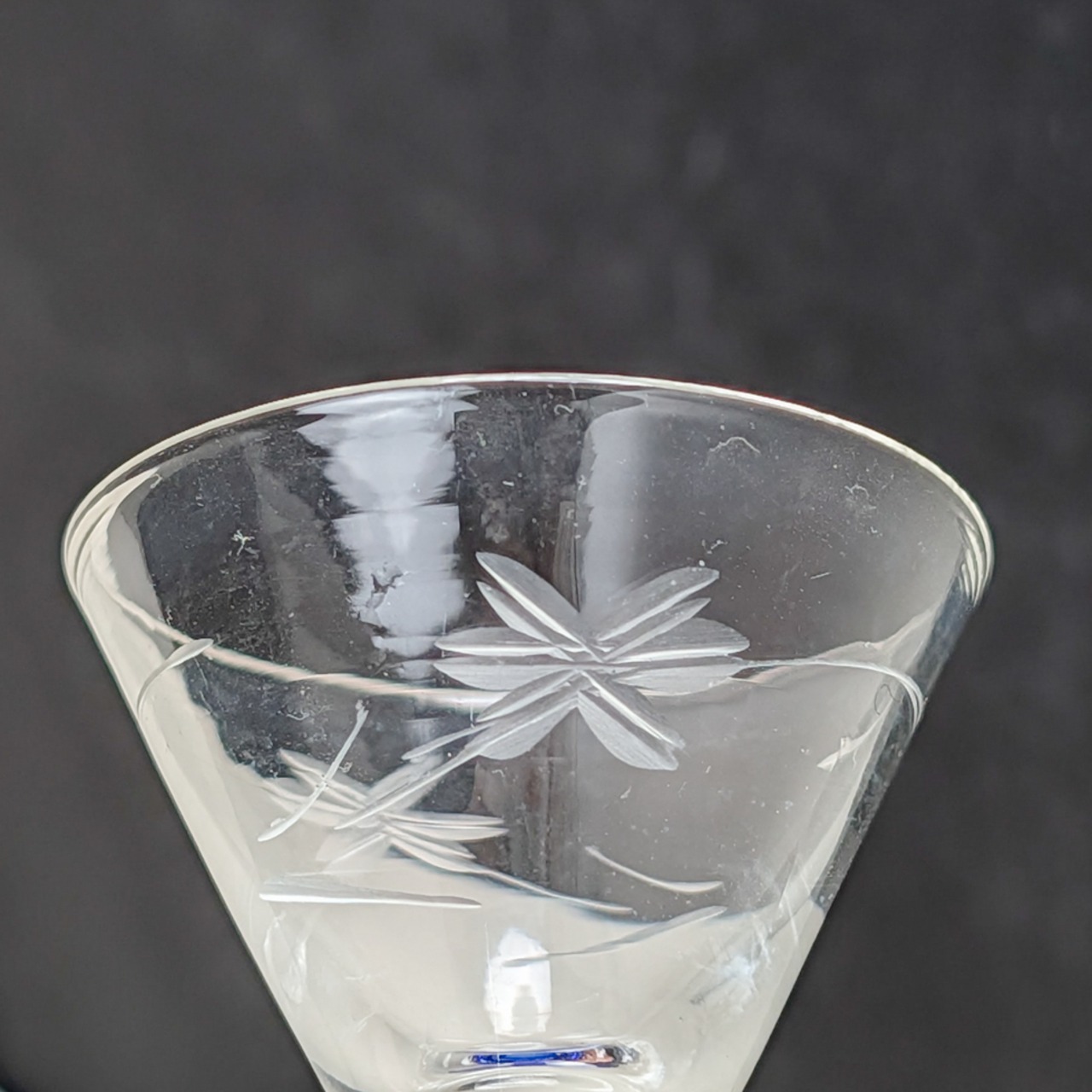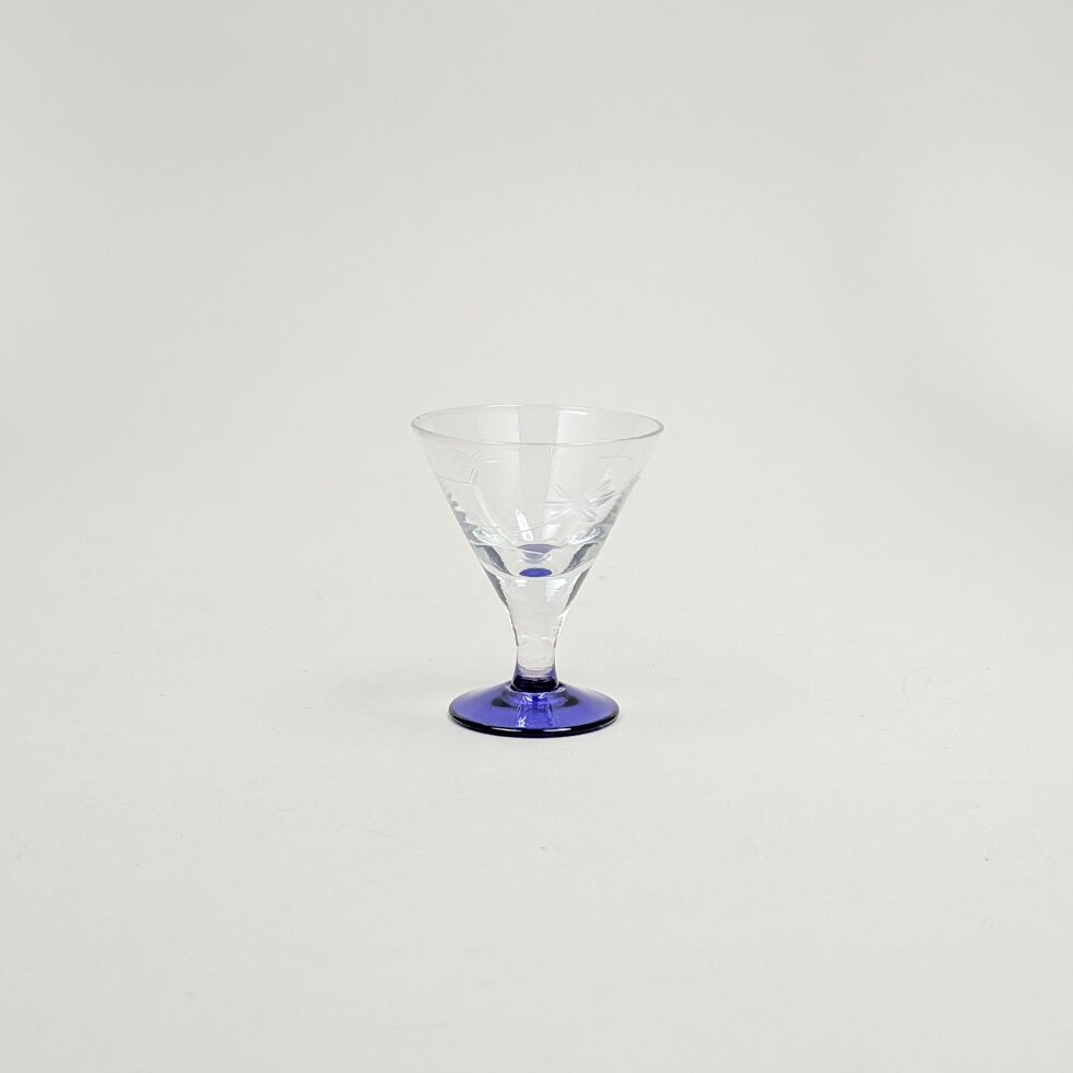 繊細な花柄の彫刻と、深いブルーの台座が美しいコントラストを生み出すリキュールグラスです。