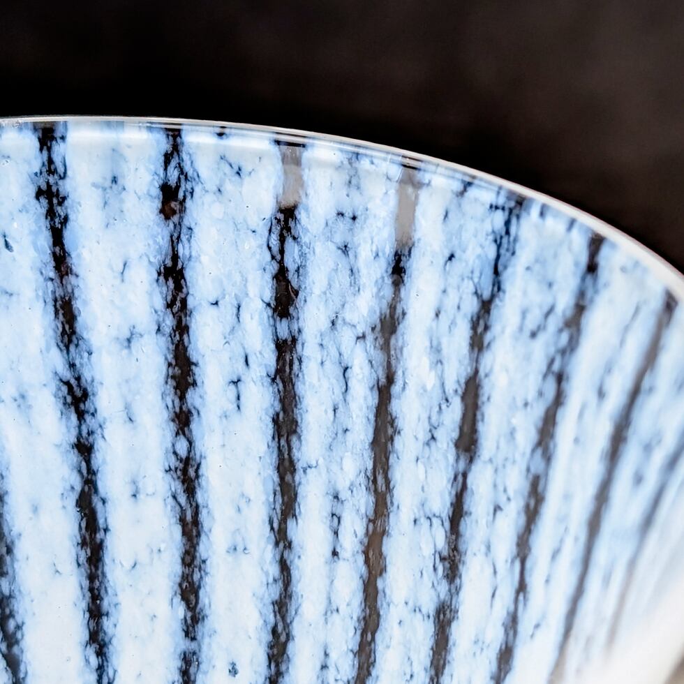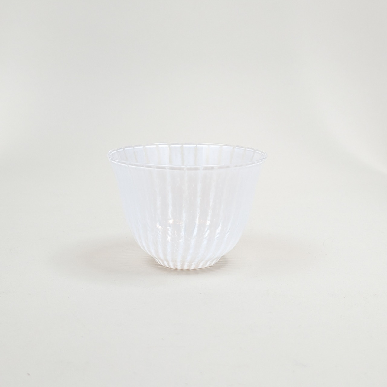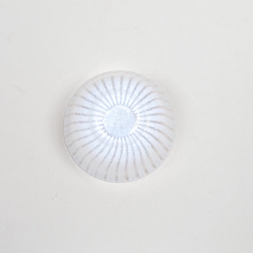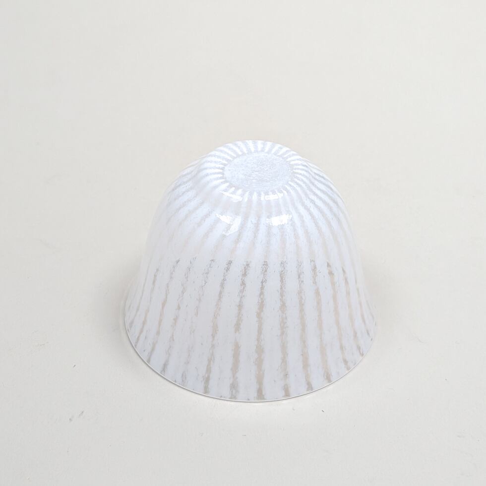 乳白がかったガラスに縦縞模様が浮かび上がり、光を受けると柔らかな陰影を映し出します。懐かしさとモダンさが同居するデザインです。