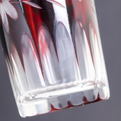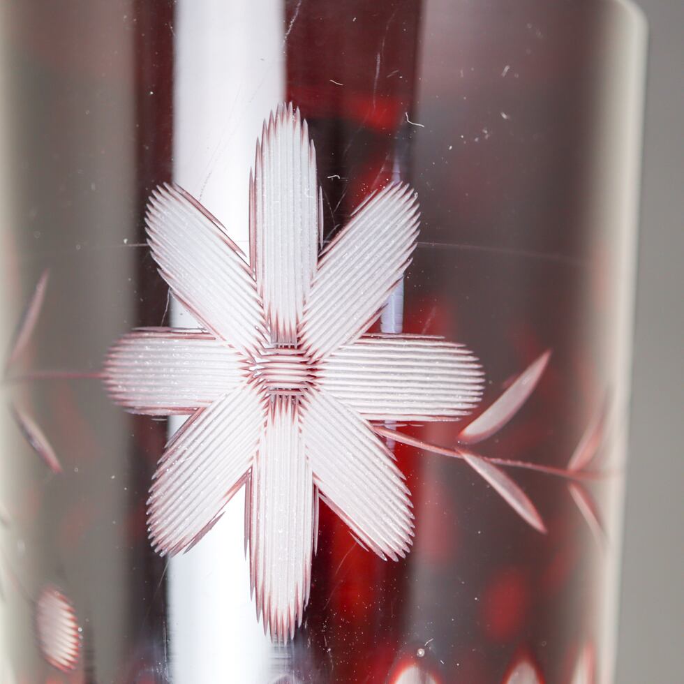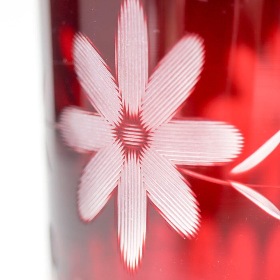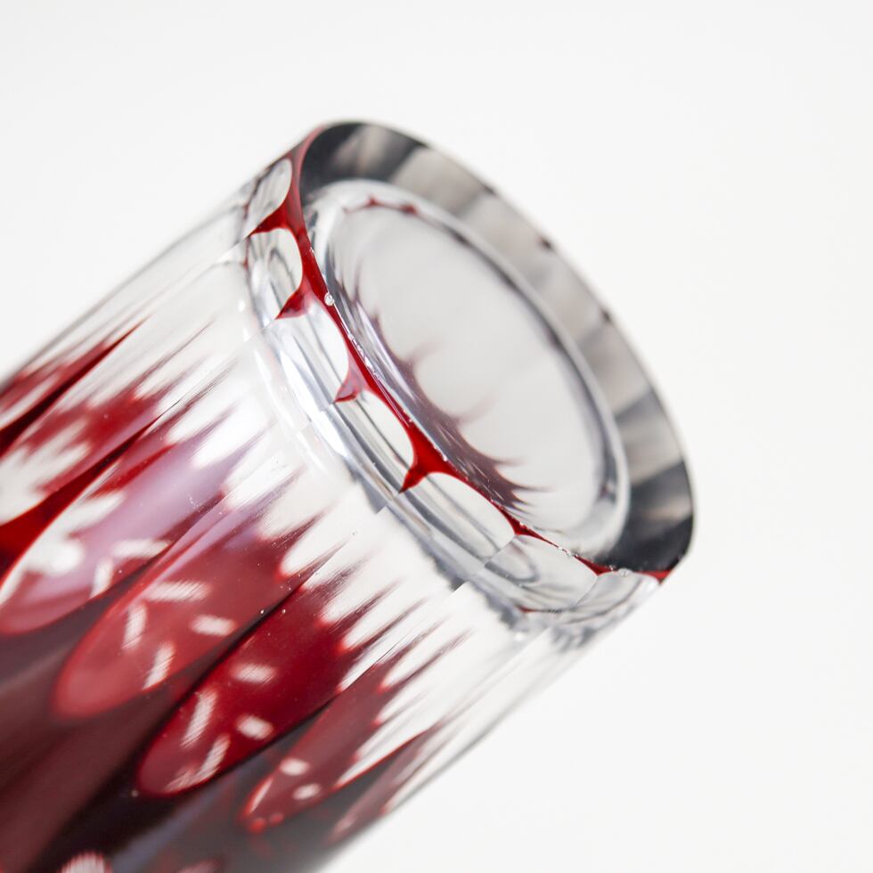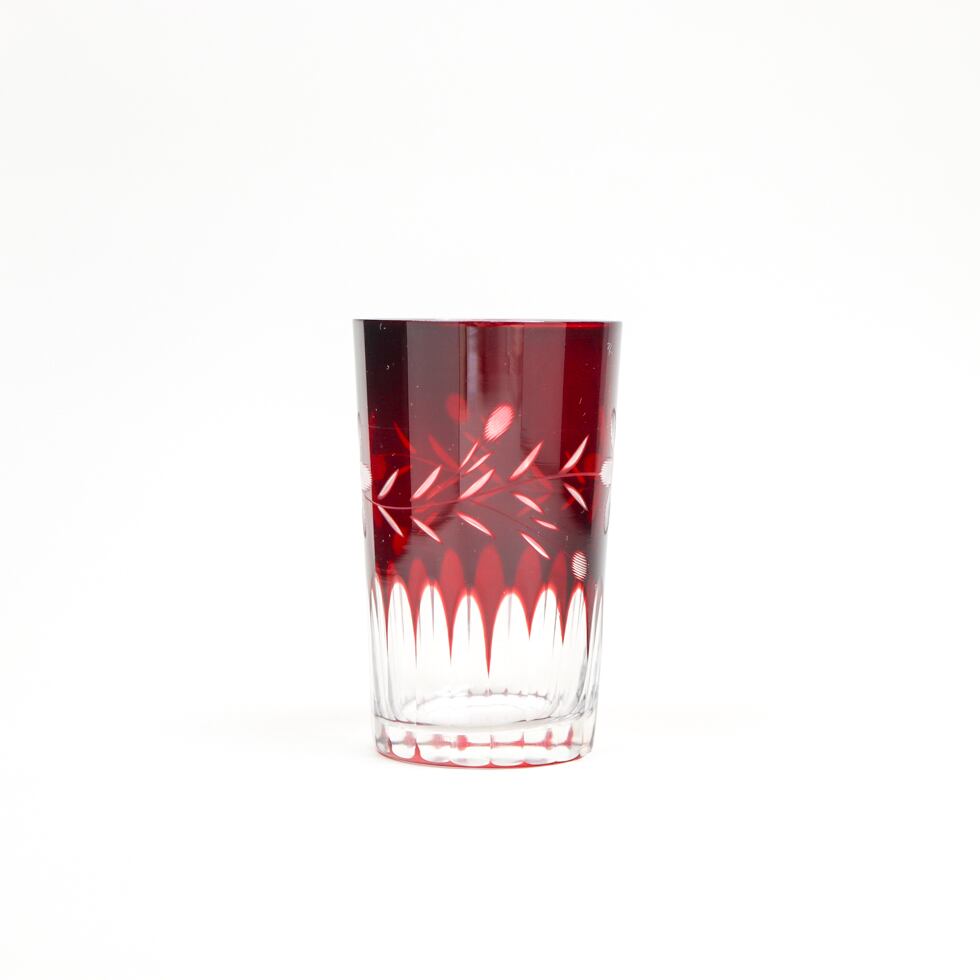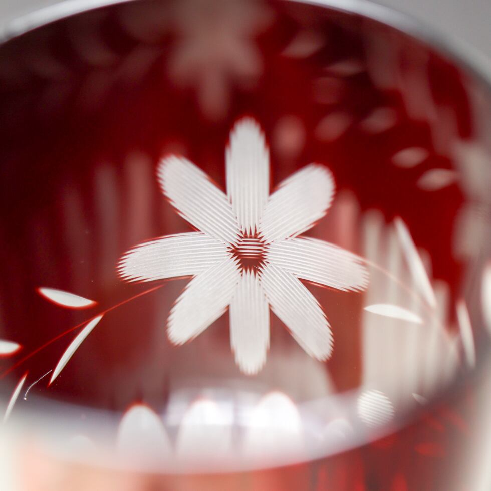 深みのある赤と透明感のコントラストが美しい昭和の切子グラスです。繊細な花文様がカットされ、光を受けるたびに表情を変える華やかな一品です。