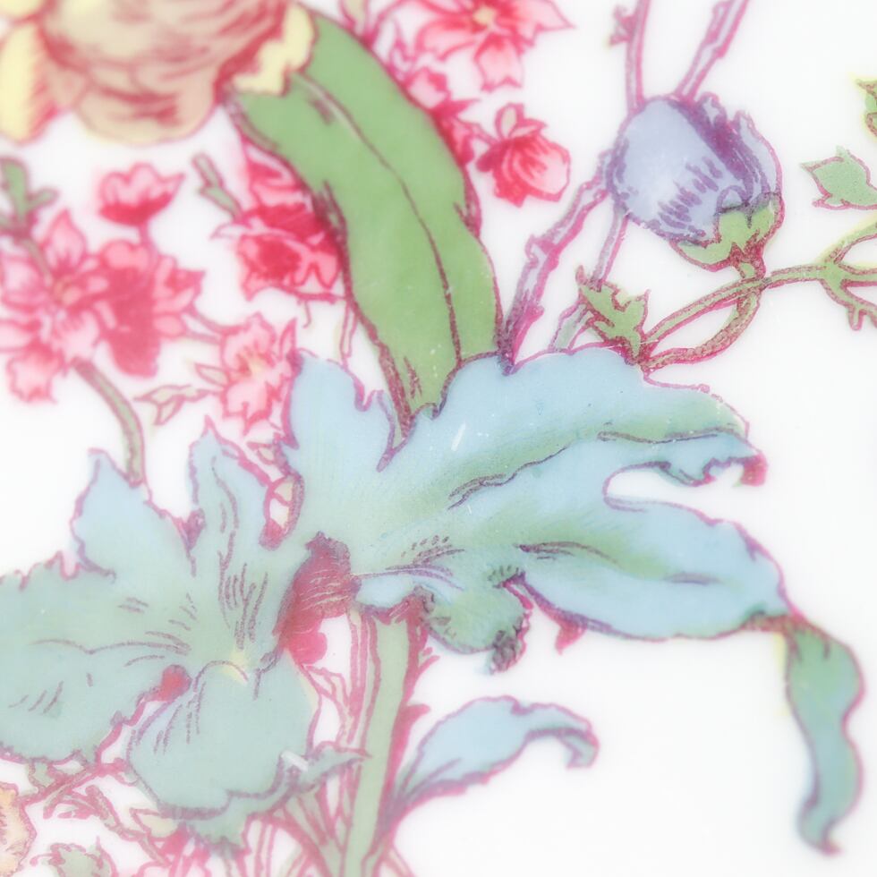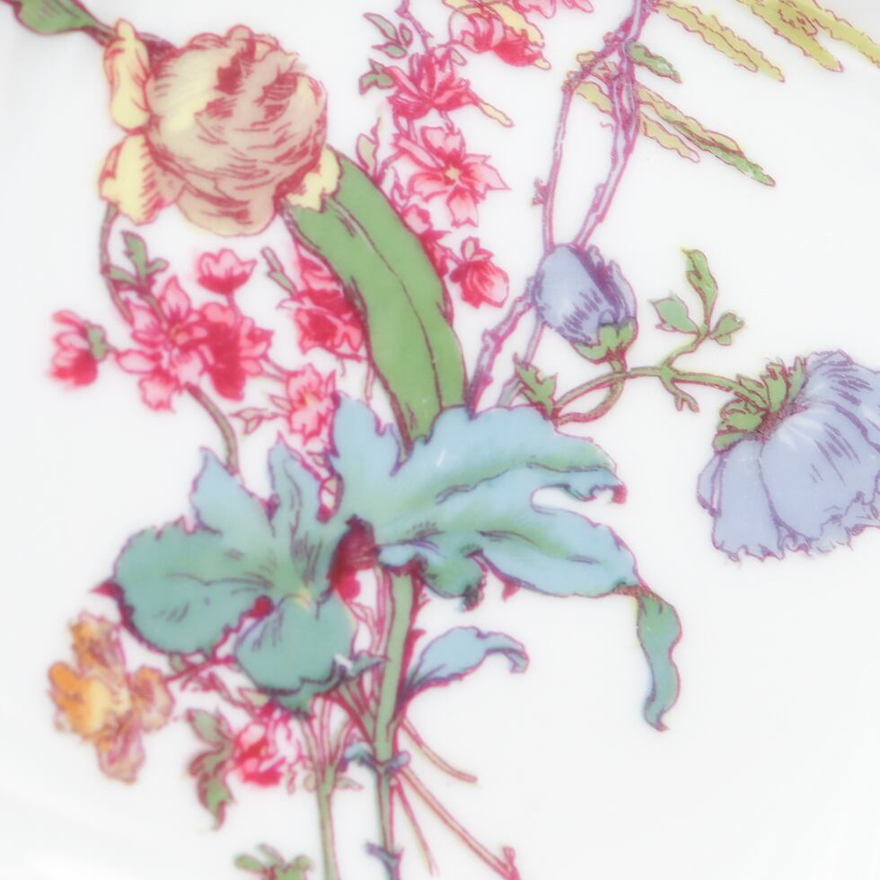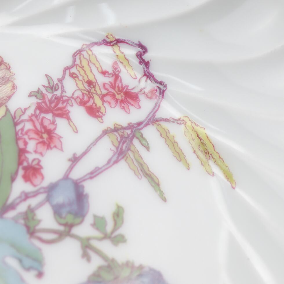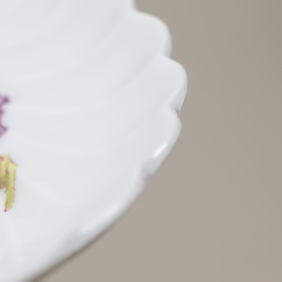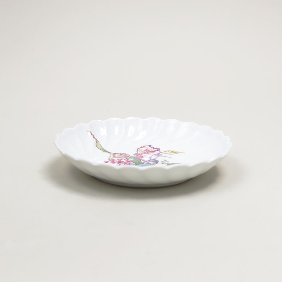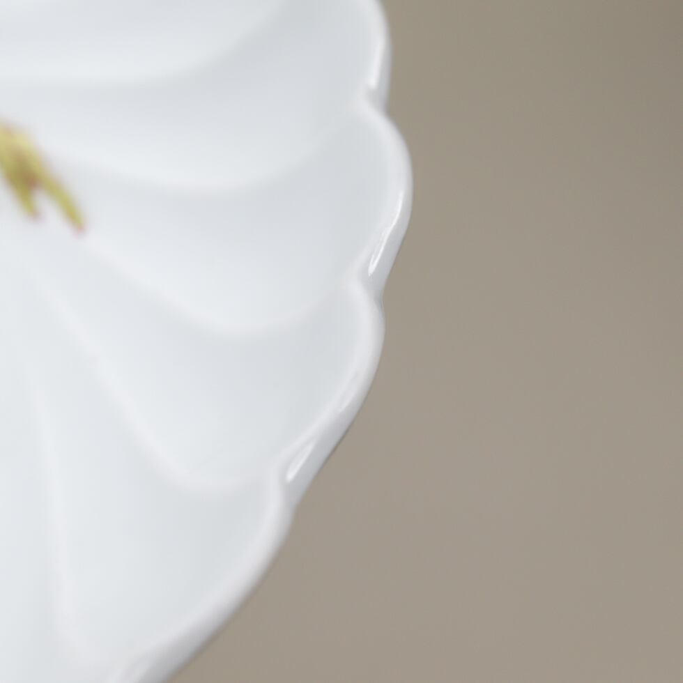 白磁の繊細な透け感を活かしたスカラップ状の縁取りと、中心に描かれた色彩豊かな花々のモチーフが上品な印象を与えます。