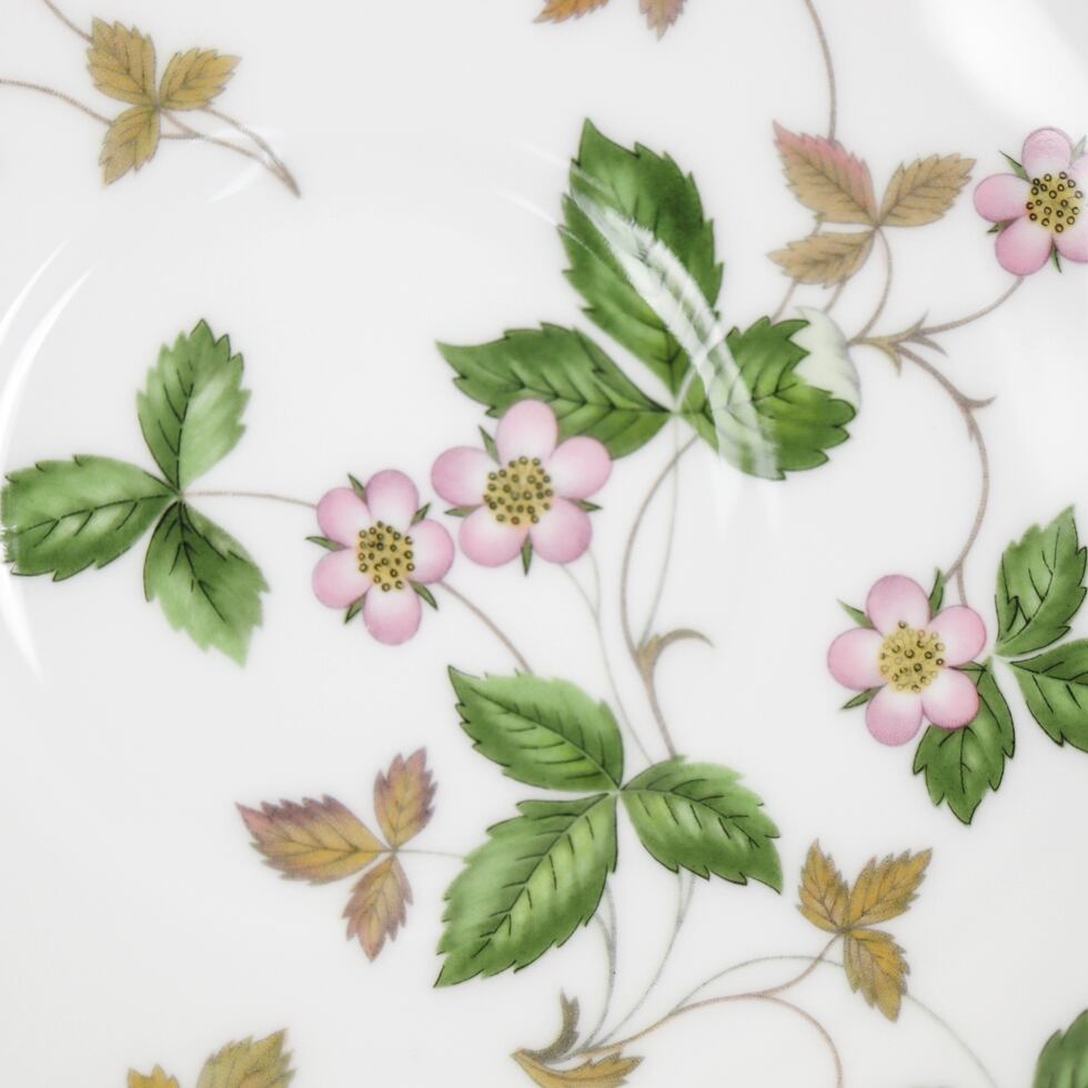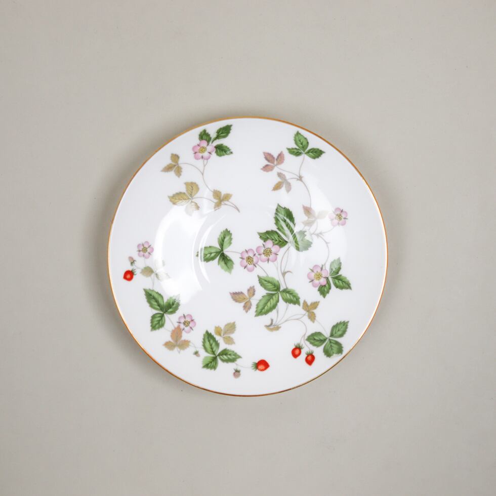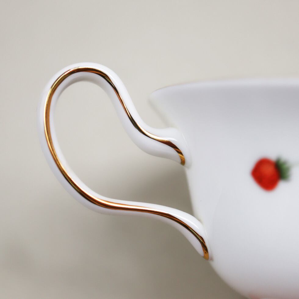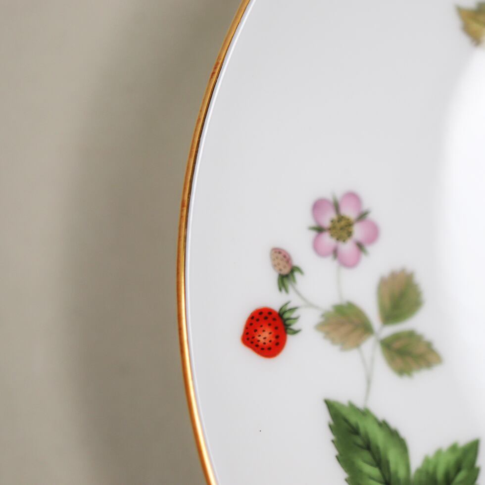 繊細なボーンチャイナに、野いちごの可憐な花と果実が優美に描かれ、金彩の縁取りが気品を添えています。