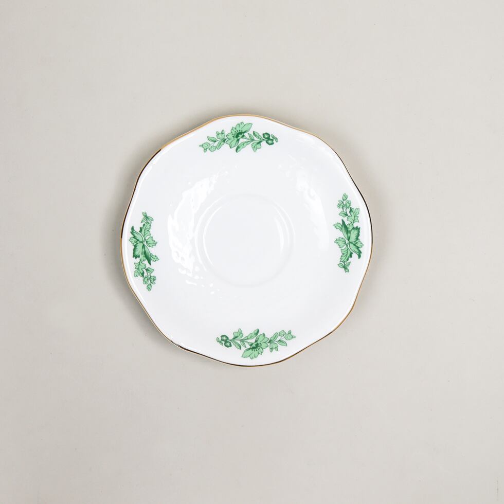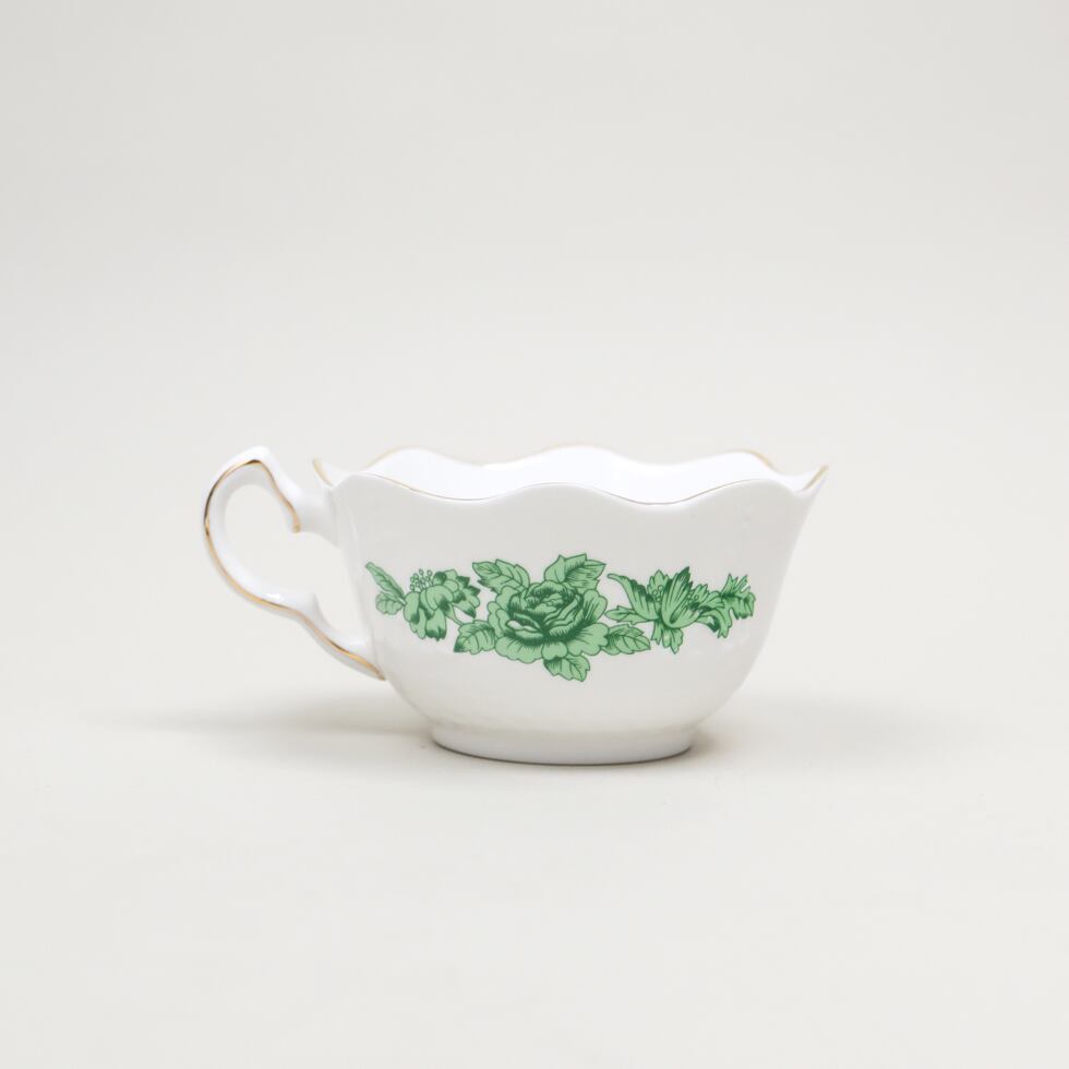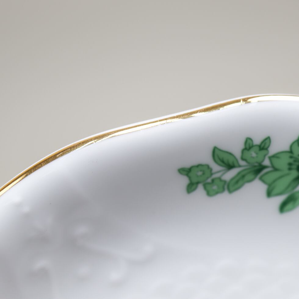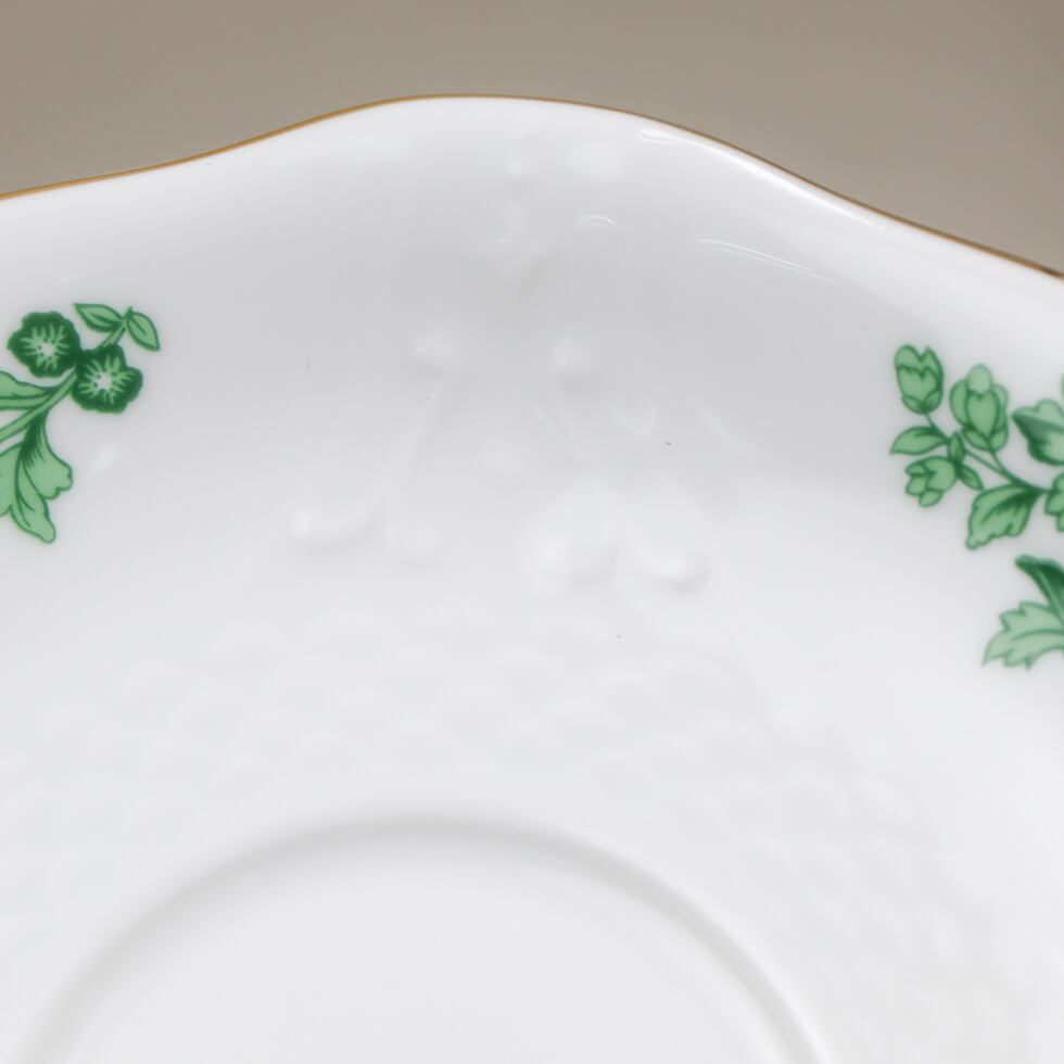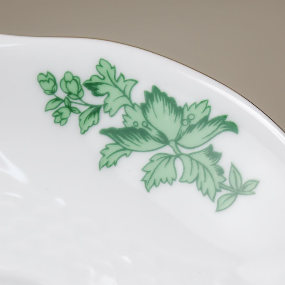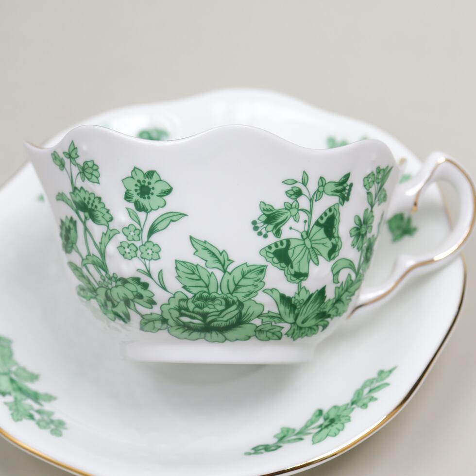ファインボーンチャイナならではの透き通るような白磁に、鮮やかなグリーンで描かれた花や蝶が爽やかな印象を与えます。