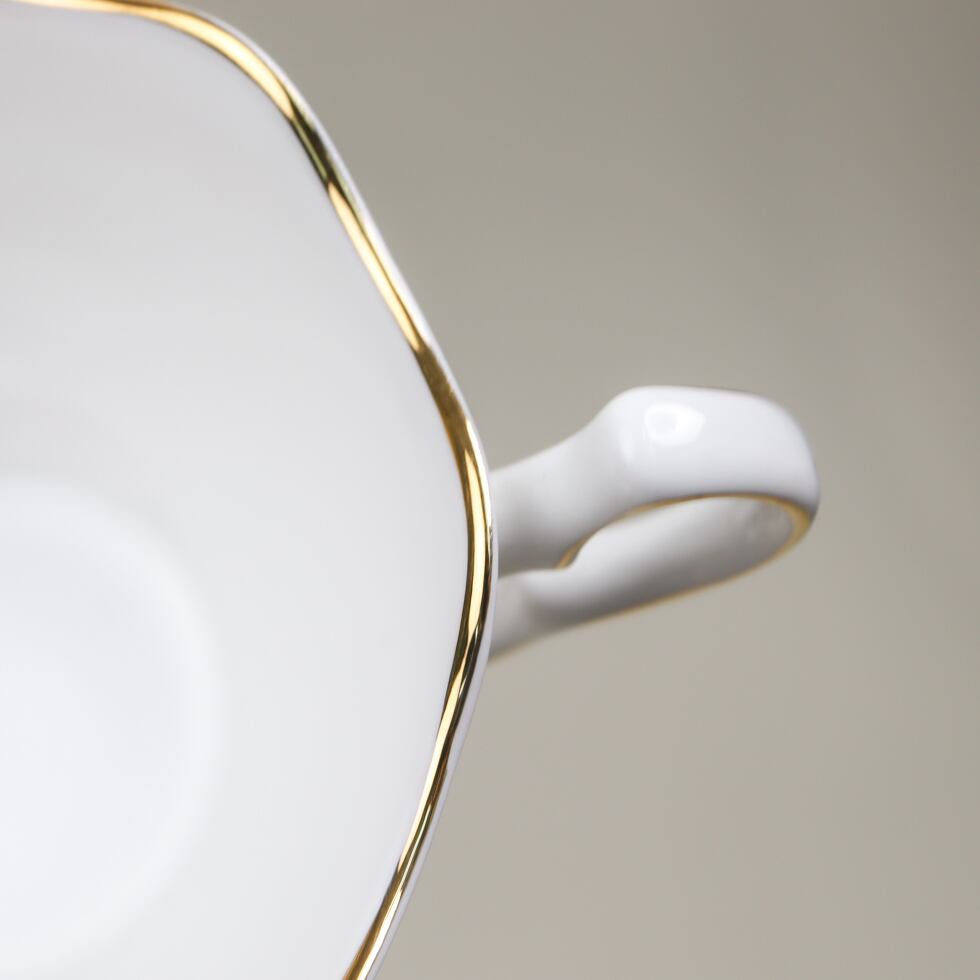 柔らかな曲線を描くカップのフォルムと、ソーサーの繊細なレリーフ模様が相まって、気品ある英国磁器の魅力を存分に楽しめる逸品です。