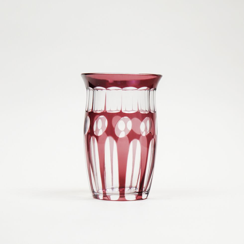 深みのある紫色と繊細なカットが美しい、日本製のレトロな切子グラスです。光に透かすと、ガラスの層がきらめき、見る角度によって豊かな表情を楽しむことができます。職人の手仕事によるカットはシャープでありながら柔らかさも感じさせ、和の美意識とモダンなデザインが融合した一品です。