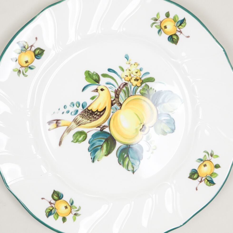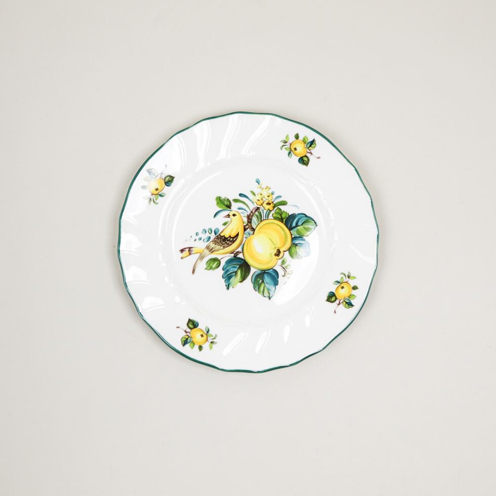 明るいイエローの果実と可愛らしい小鳥が描かれた、南国の陽ざしを思わせるような華やかなデザインが魅力です。
