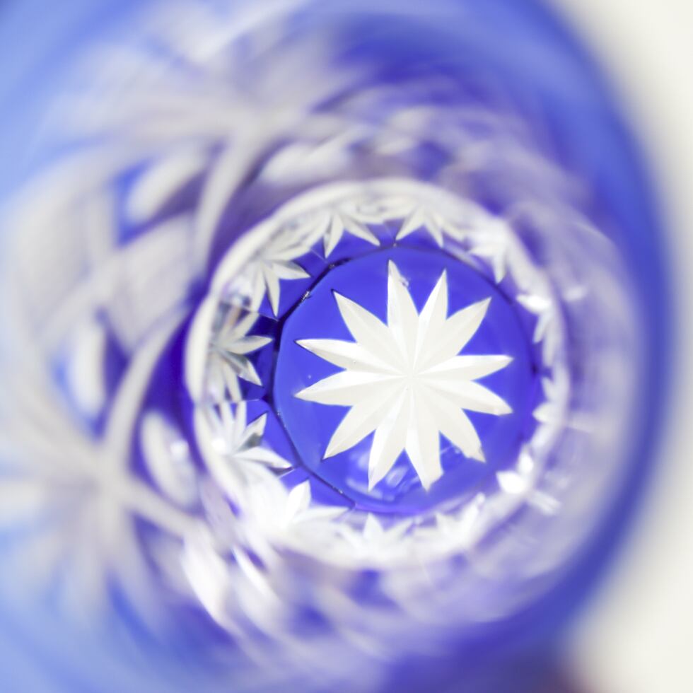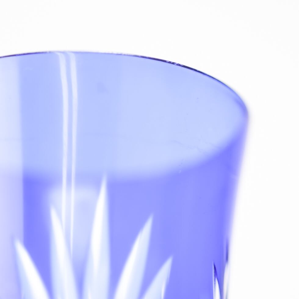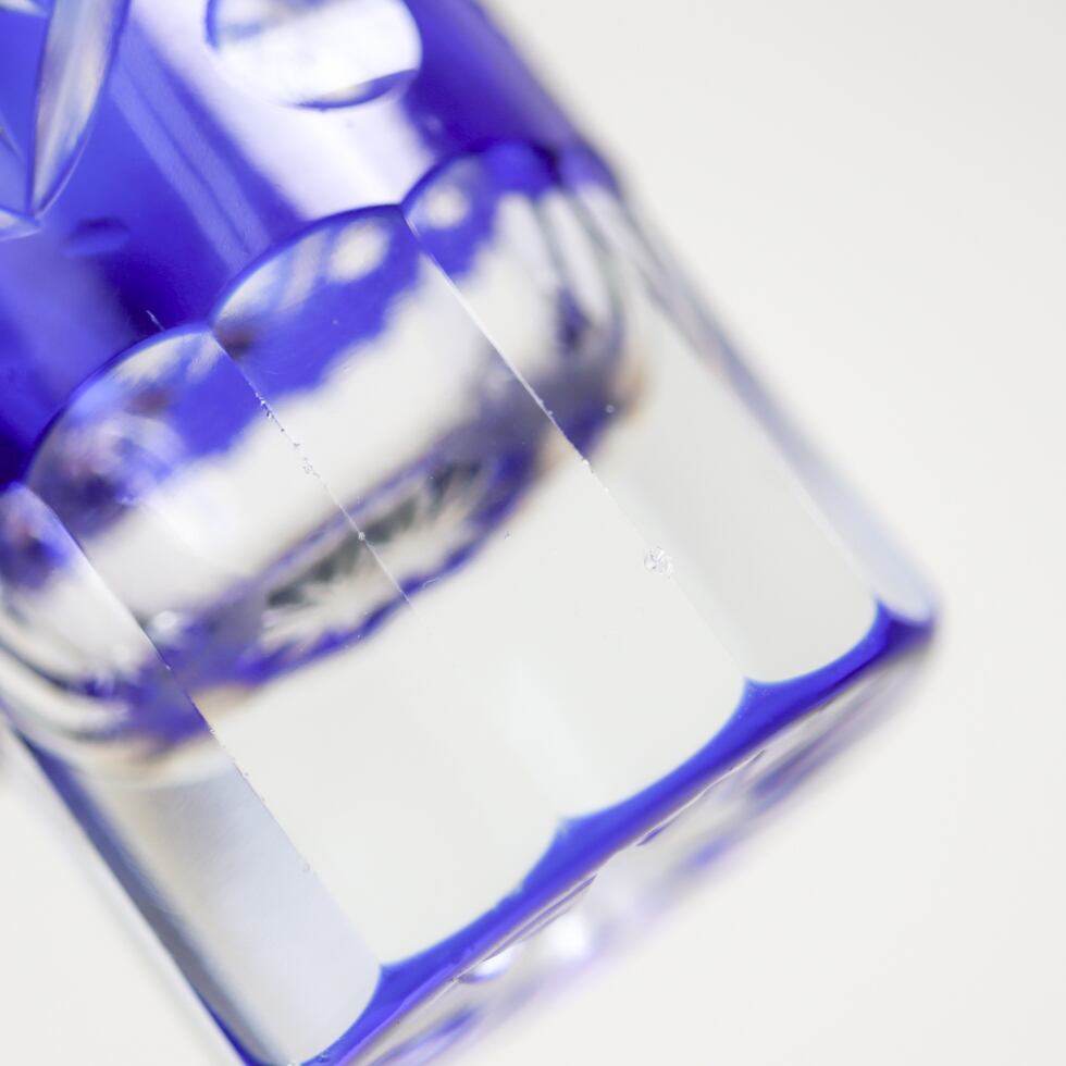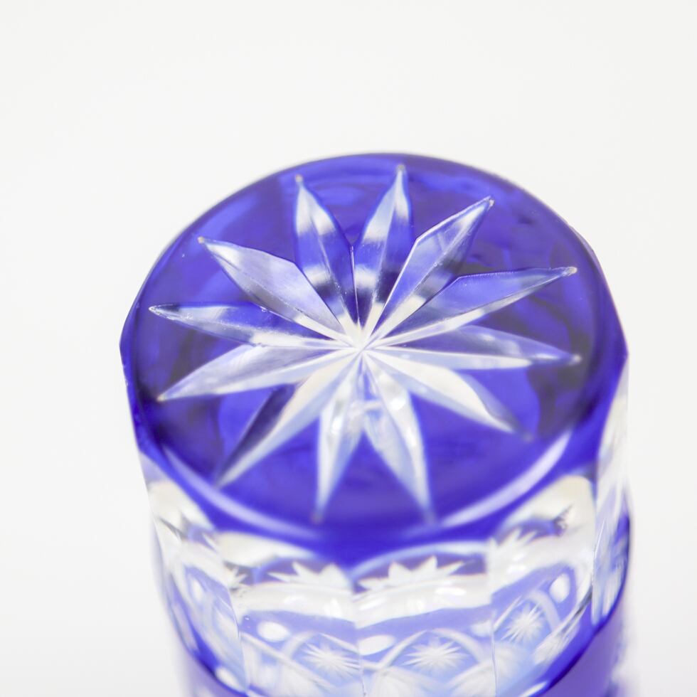 深みのある瑠璃色のガラスに、熟練の職人によって繊細なカットが施され、光の反射で美しい輝きを放ちます。涼やかでありながら凛とした印象を与える一本で、手に取るたびに職人技の確かさが伝わります。