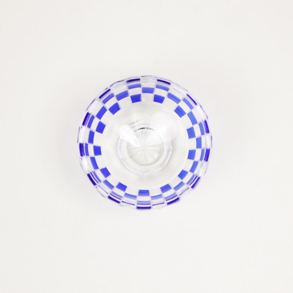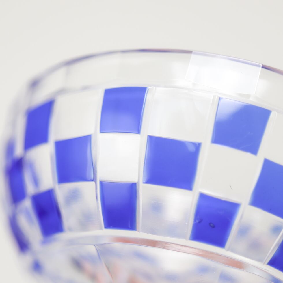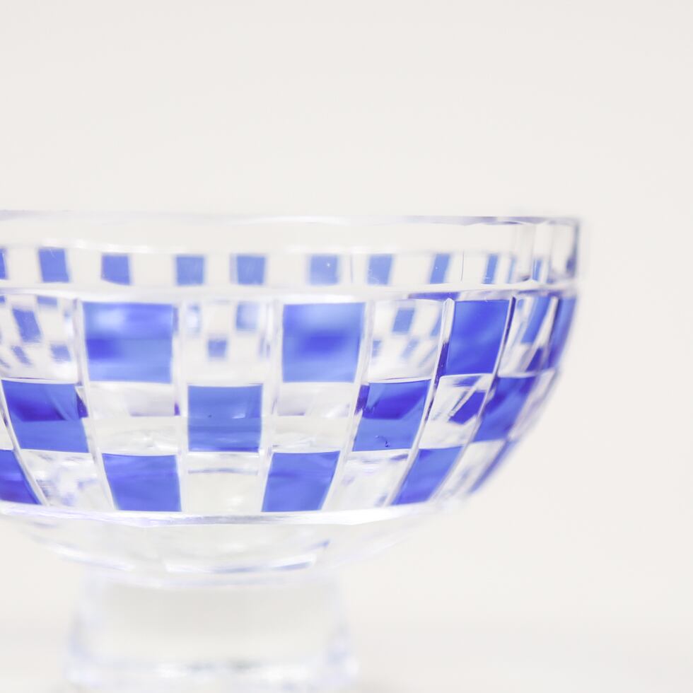 透明なガラスに深い瑠璃色が重なり、格子状に刻まれた市松模様が美しく光を反射します。
