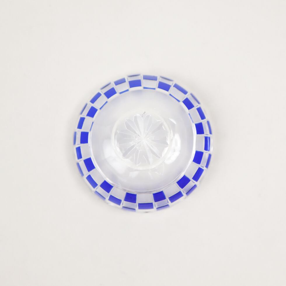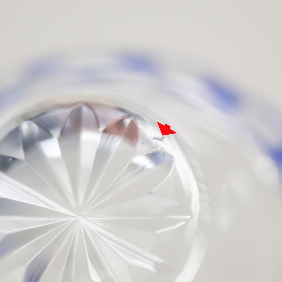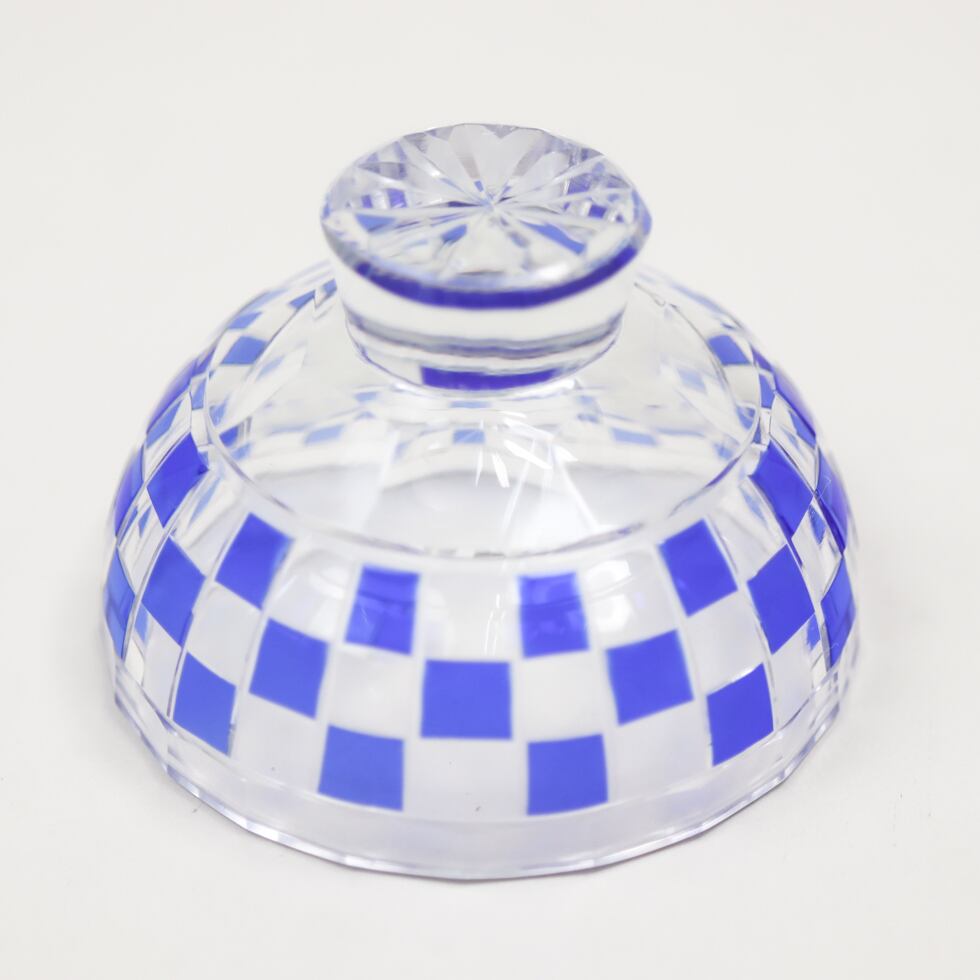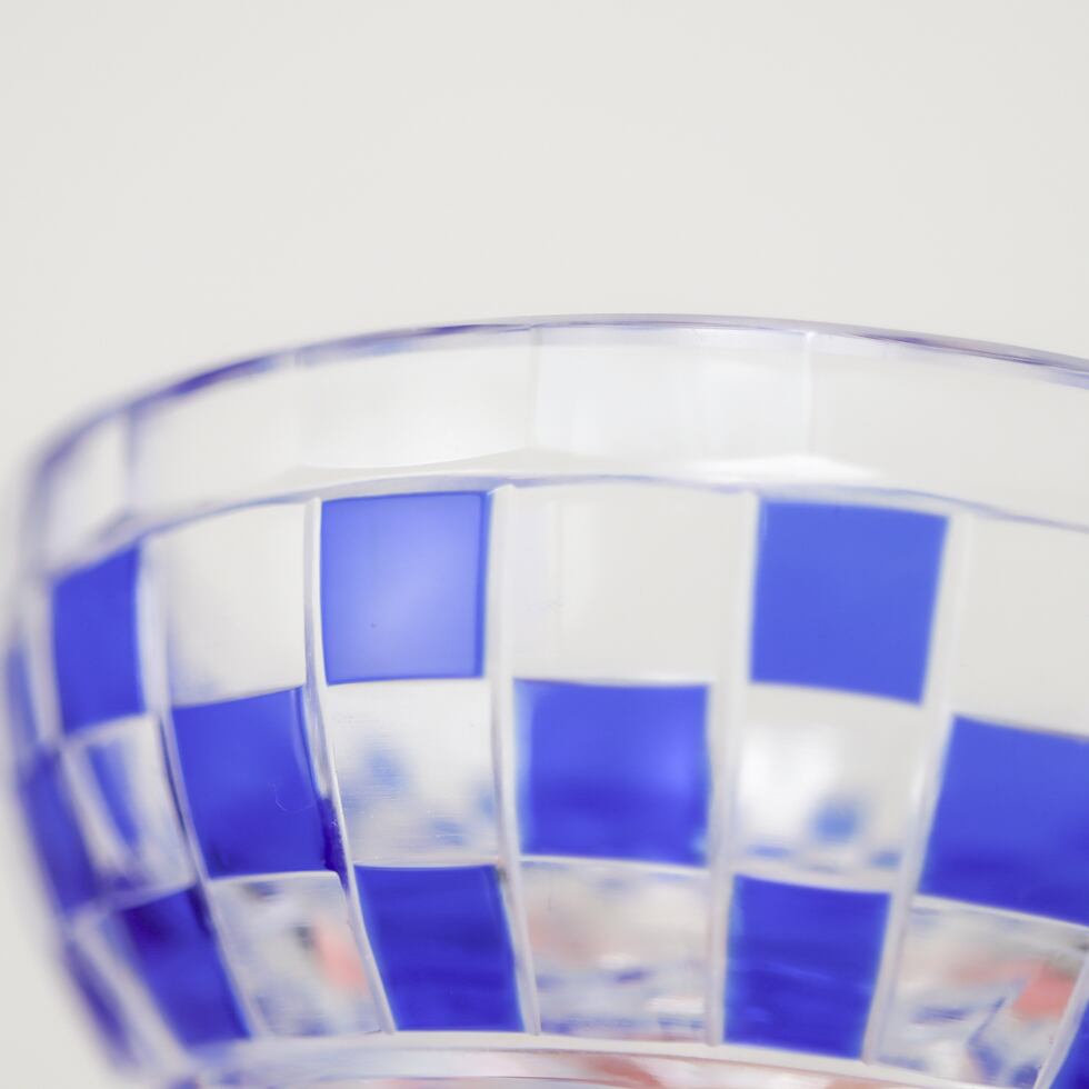 透明なガラスに深い瑠璃色が重なり、格子状に刻まれた市松模様が美しく光を反射します。