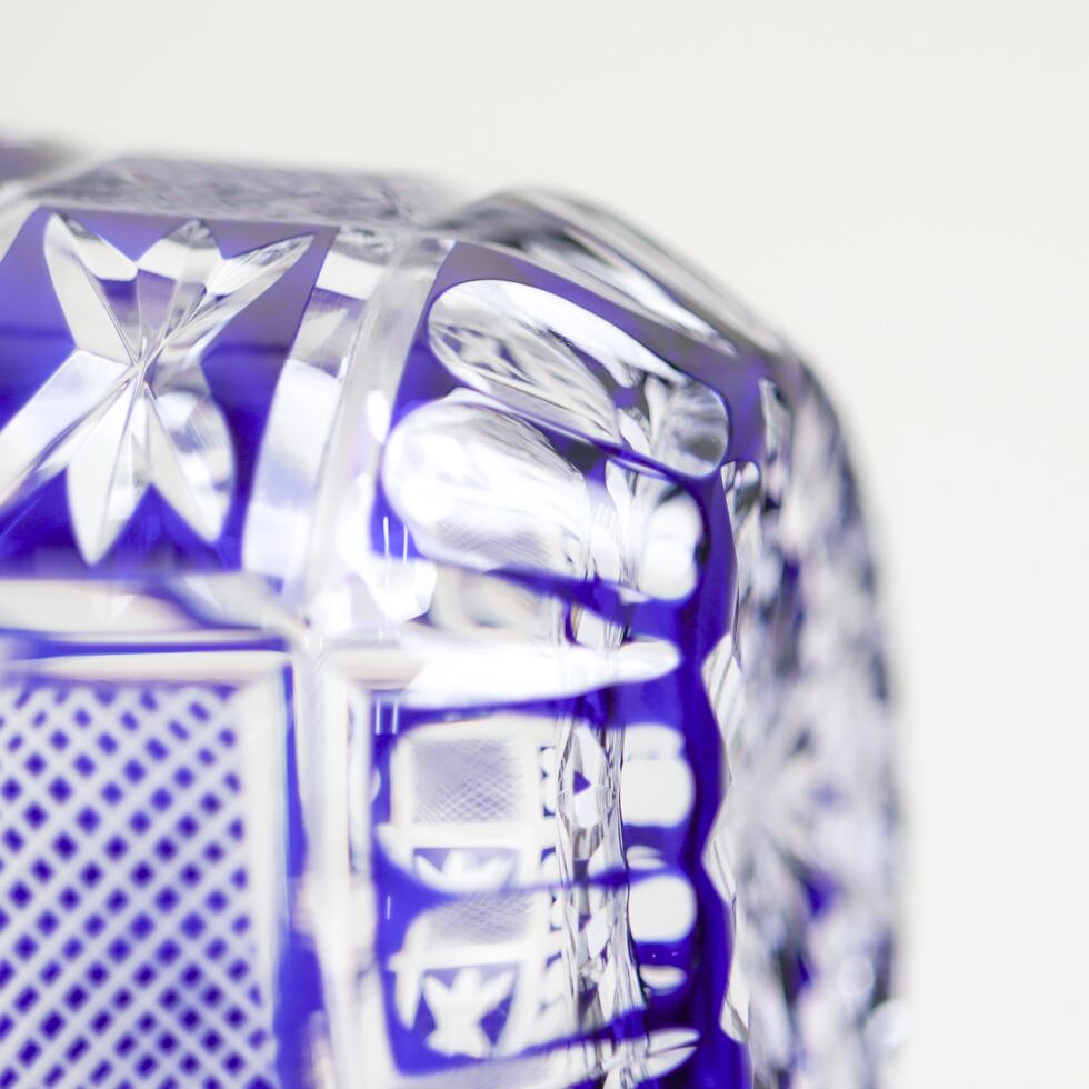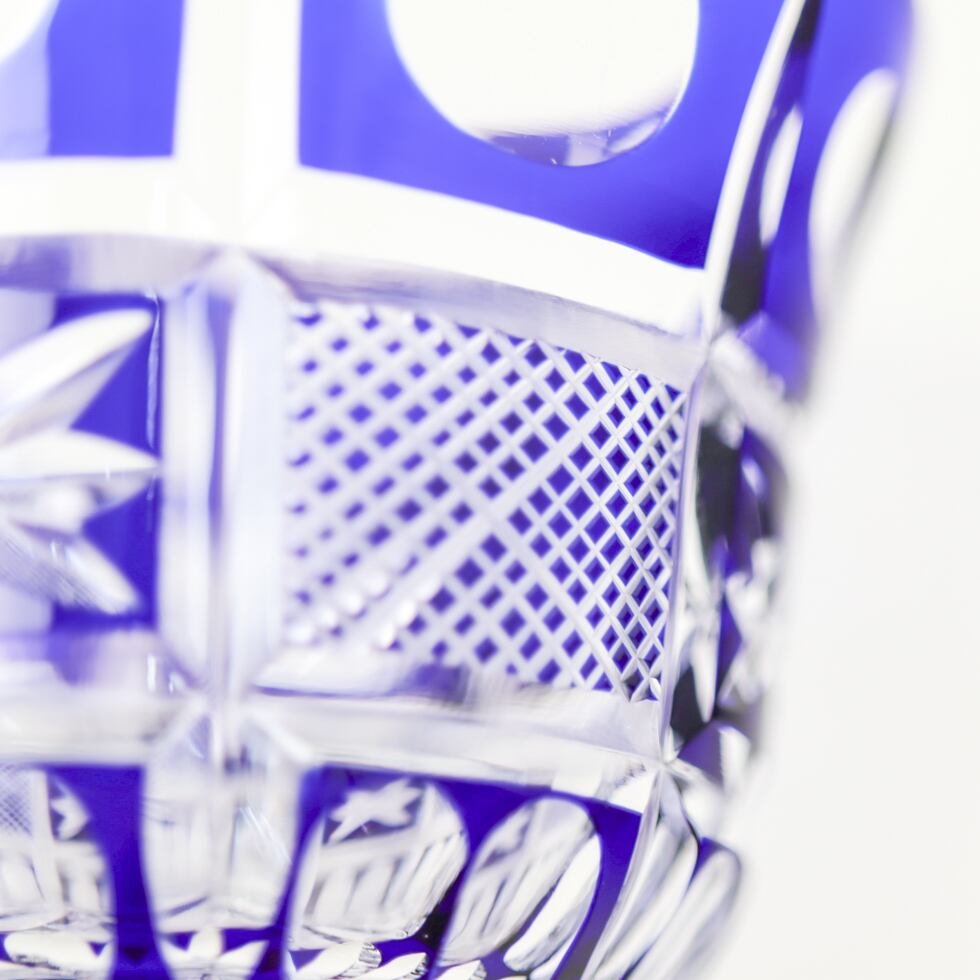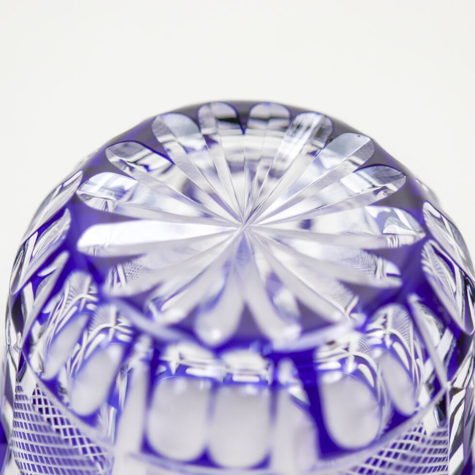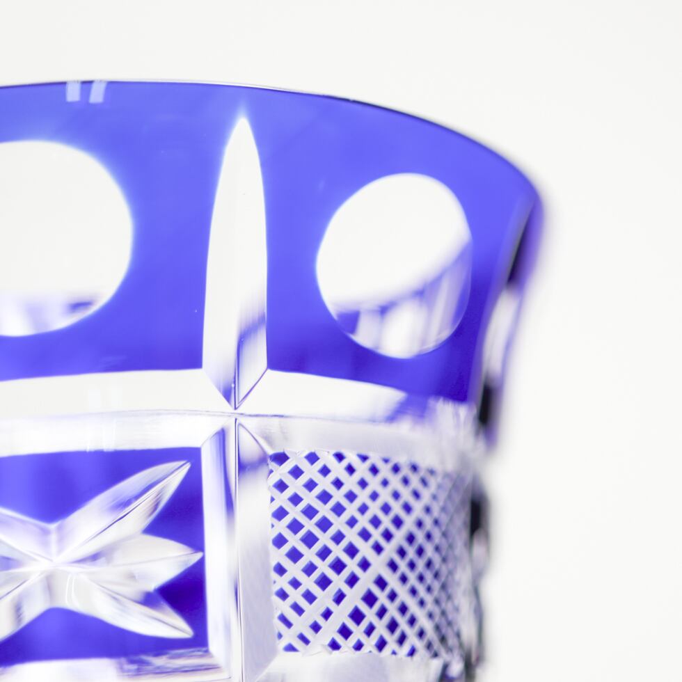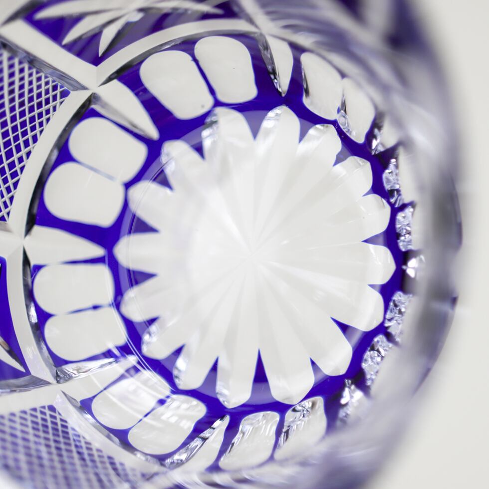 澄んだ青のガラスに、繊細なカット模様が美しく映える一品。