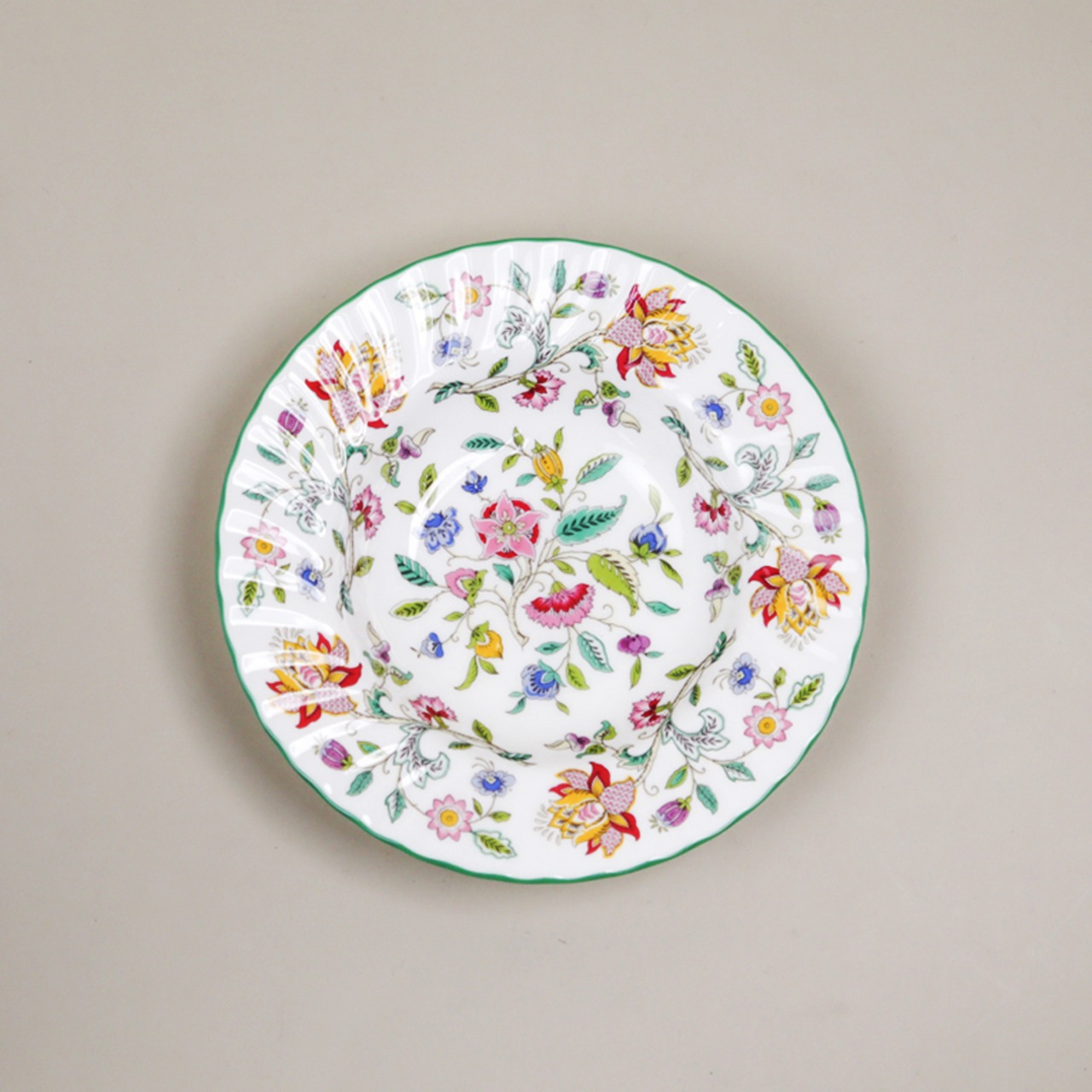 ミントンらしい艶やかな白磁と、手描き風の繊細な絵付けが特徴で、どの角度から見ても絵画のような美しさを楽しめます。