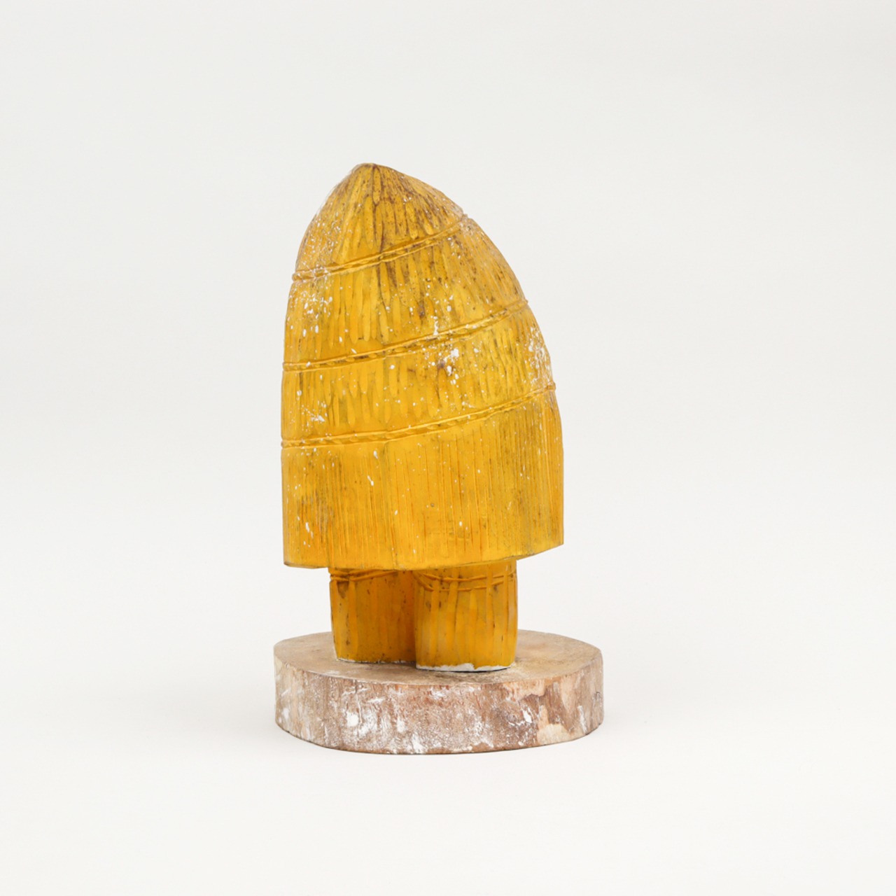 農民美術特有の「のみ跡」を残した素朴な彫りが特徴で、木の温もりと手仕事の力強さが感じられる一品です。鮮やかな黄色い蓑と、着物の絣(かすり)模様の対比も美しく、どこか懐かしい昭和レトロな雰囲気を漂わせています。