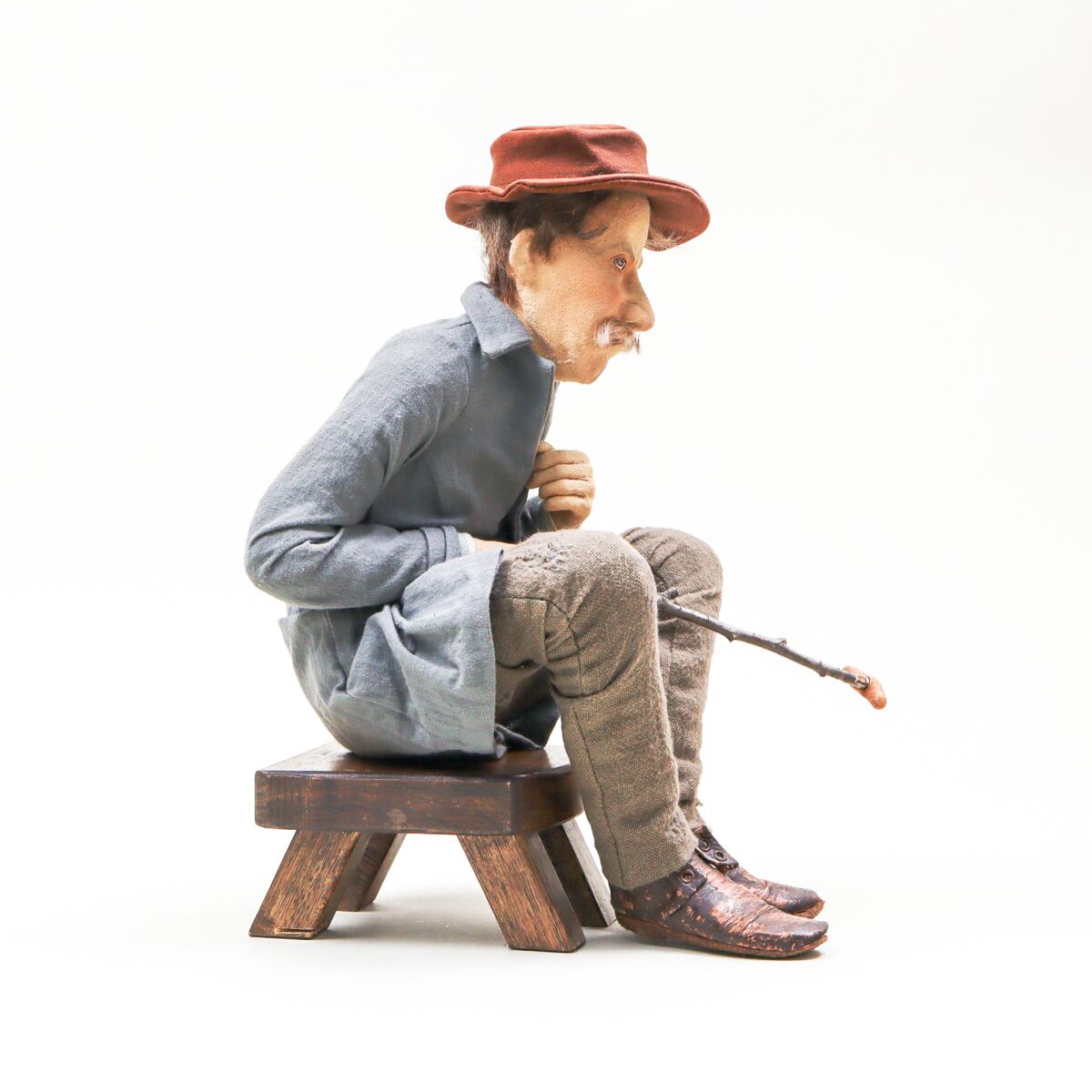 布を素材とした日本の創作人形(アートドール)です。 旅の途中でしょうか、スツールに座り一休みする中年男性の姿が表現されています。