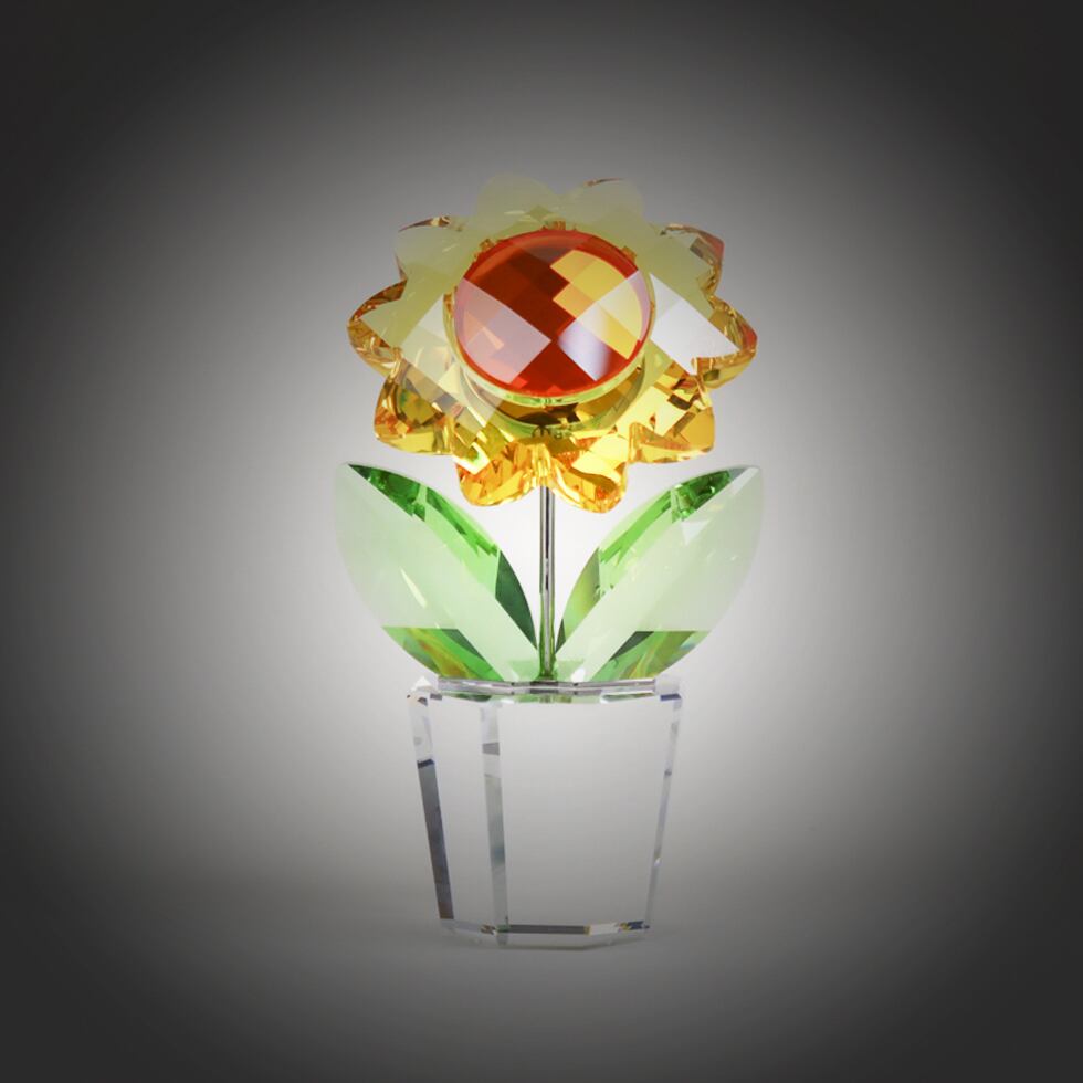 花びら一枚一枚に施された精密なファセット・カットが、太陽の光を捕らえては全方向に放ち、まるでお部屋の中に本物の光が差し込んだかのような明るさをもたらします。鮮やかなイエロー・オレンジのグラデーション、落ち着いたアンバーカラーの花芯、そして生き生きとしたグリーンの葉が、スワロフスキーならではの最高級クリスタルで見事に表現されています。